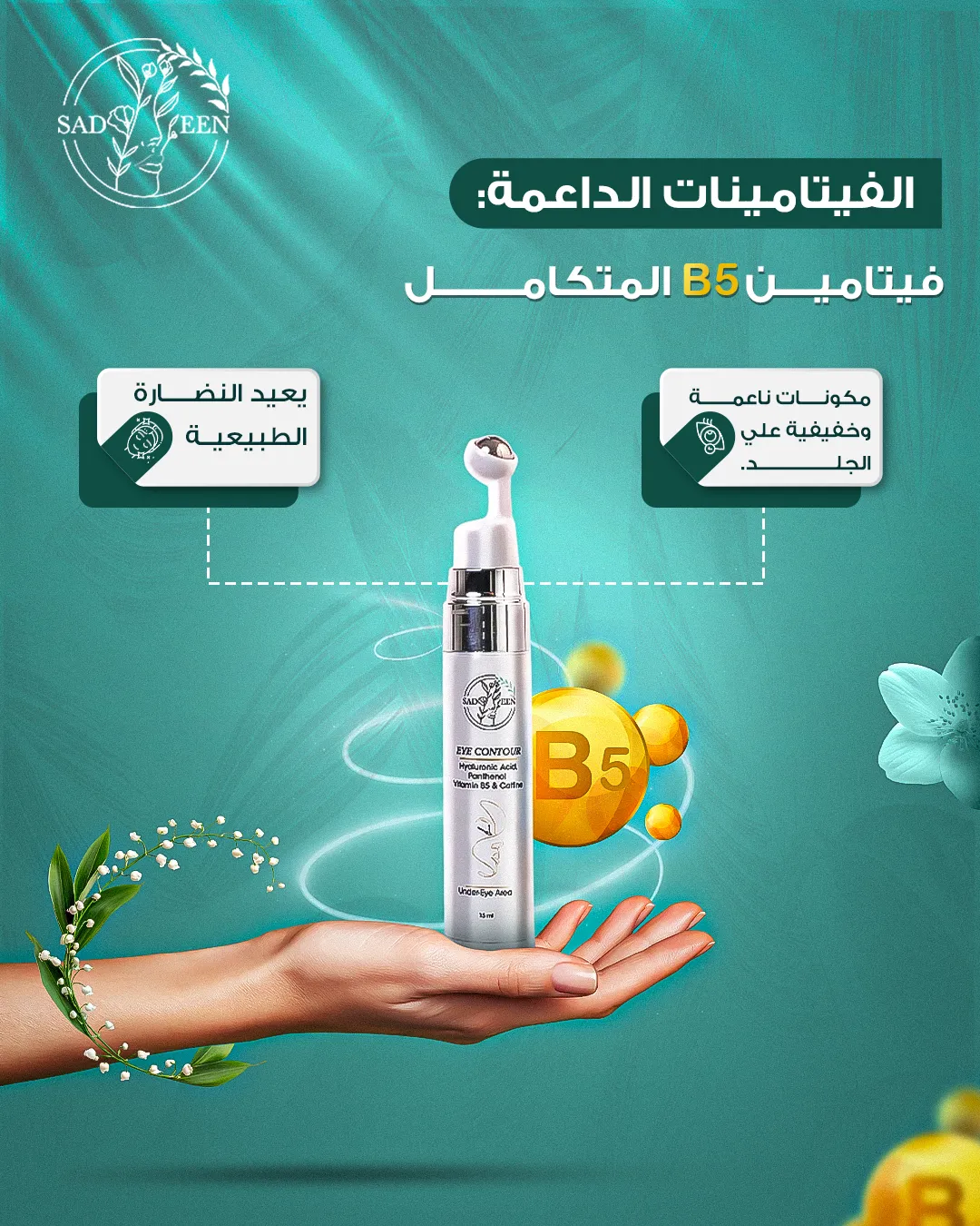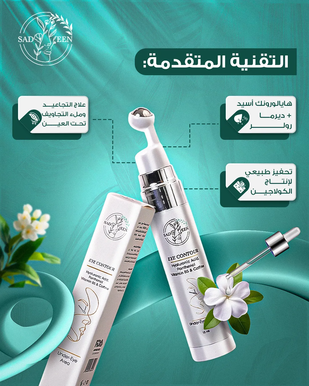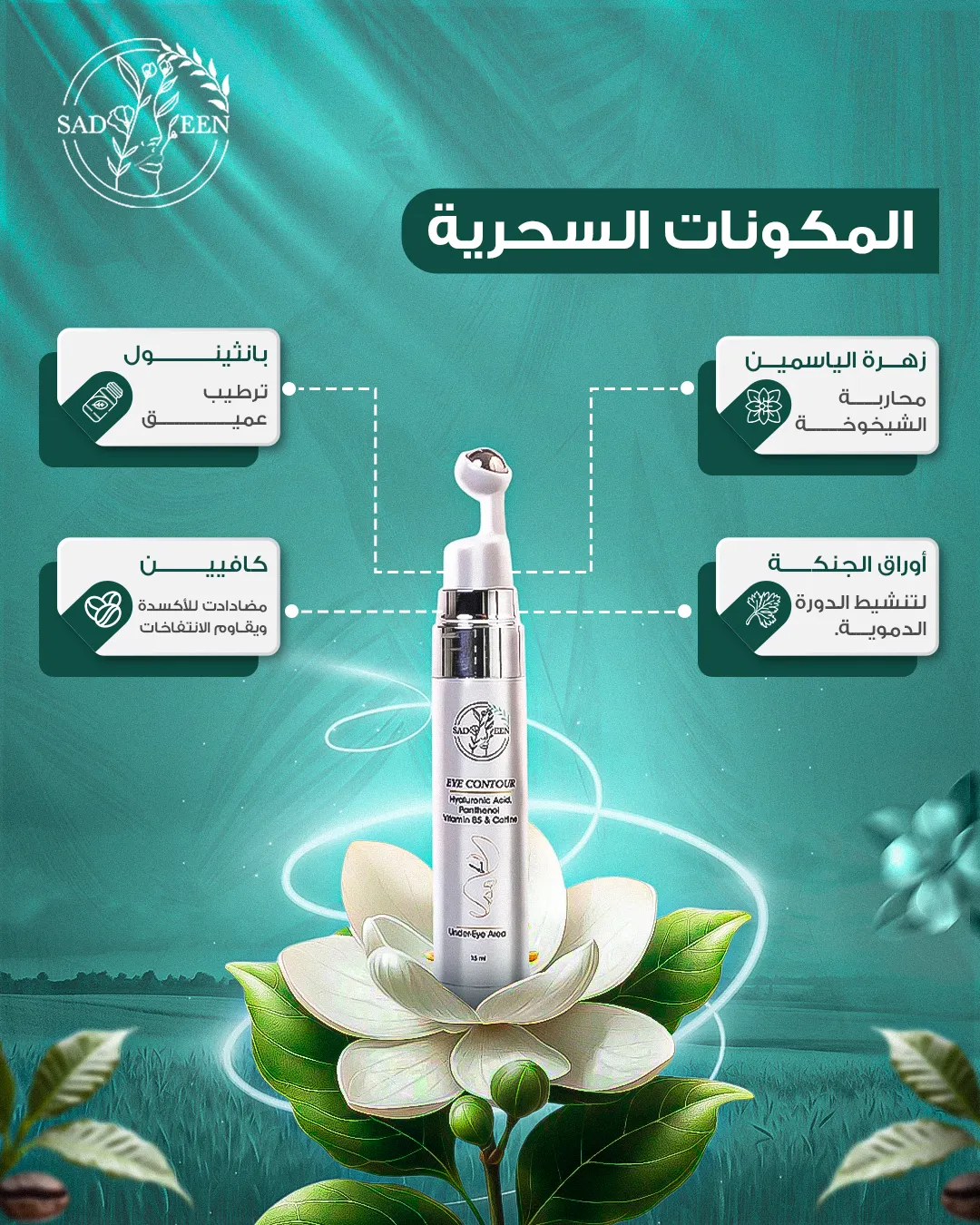 Sadeen Organic Eye Contour Cream is an advanced treatment specifically designed to care for the delicate skin around the eyes. Its rich formula, with Hyaluronic Acid and Peptides, deeply moisturizes the skin and enhances its elasticity, helping to reduce the appearance of fine lines and wrinkles. Caffeine and Vitamin K help stimulate microcirculation and visibly reduce puffiness and dark circles. Thyme flower, which limits signs of aging, also acts as a healing and restorative agent for any scars or wounds around the eye contour area. The cream features a lightweight, fast-absorbing texture and comes with a cool metal applicator that helps enhance the refreshing effect and reduce puffiness. Bid farewell to signs of fatigue and exhaustion and restore the radiance of your eyes.