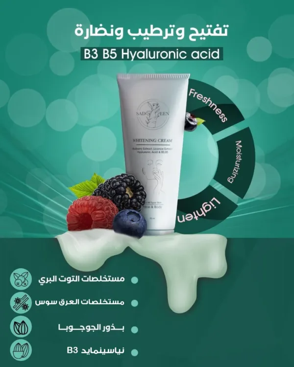 Advanced Whitening for Flawless Skin Sadeen Organic Whitening Cream is specifically designed to address hyperpigmentation and uneven skin tone. Its potent formula, enriched with ingredients like White Mulberry Root and Vitamin C, works to inhibit excess melanin production, effectively reducing the appearance of dark spots, age spots, and acne marks. Hyaluronic Acid and Niacinamide (Vitamin B3) deeply hydrate the skin and strengthen its natural barrier, while Licorice Root Extract brightens and soothes. Suitable for all skin types, this cream gives you brighter, smoother, and more even-toned skin with regular use.